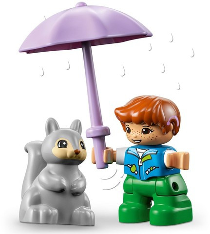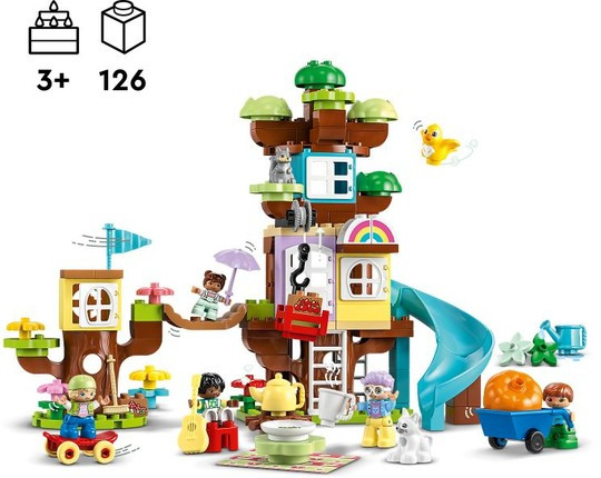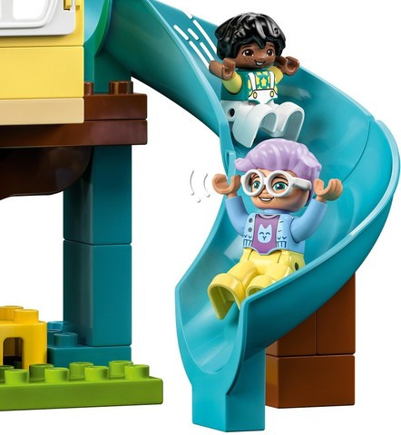 Малките приключенци над 3 години откриват безброй начини да се забавляват, докато изследват играчката LEGO® DUPLO® Дървесна къща „3 в 1“ (10933). Комплектът е изпълнен с функции за откриване и може да бъде сглобен по 3 различни начина за наистина креативно конструиране. Ученето чрез игра развива въображението Първо децата построяват страхотна зона за приключенска игра с 3 нива, супер дълга пързалка и люлеещ се мост за преминаване. Ако се съберат дъждовни облаци, конфигурацията на модела се променя на уютна дървесна къща. Третият модел се състои от 2 дървесни къщи, всяка с пързалка, и градина, където децата помагат при събирането на плодовете и пренасянето им до дървесната къща с помощта на сладката макара. Децата се учат чрез игра Комплектът се предлага с разнообразна гама от играчки, включително фигура на баба, 4 деца, птица, котка и катерица, така че родителите да могат да играят заедно с малкото си дете и да го учат на социални умения и групова игра. С набор от креативни аксесоари, малките строители изследват себеизявата, докато измислят безкрайни истории с въображение.