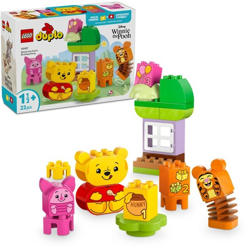 Родителите и малките деца се наслаждават на творческа игра и се учат чрез игра с конструктора LEGO® DUPLO® ǀ Disney Парти за рождения ден на Мечо Пух (10457). Тази цветна образователна играчка за построяване помага на малки деца на възраст над 18 месеца да практикуват ранни умения, докато се наслаждават на въображаема игра. Децата в предучилищна възраст си представят как са на парти с трите фигури LEGO DUPLO на Мечо Пух, Тигър и Прасчо. Всеки герой има двустранно лице с различни изражения, което предизвиква неограничена творческа игра и създаване на истории. Тази забавна функция предоставя и възможност за социално-емоционални учебни дейности за малки деца, докато изследват различните емоции, които децата могат да изпитат на парти, от радостта от отварянето на подаръци до дискомфорта след ядене на твърде много лакомства! Тази играчка за построяване позволява на децата в предучилищна възраст да упражняват сортиране на цветове, докато съчетават подаръците за рожден ден с героите-животни. Тъй като всеки подарък е номериран, децата в предучилищна възраст могат дори да започнат да правят първите си стъпки в броенето.