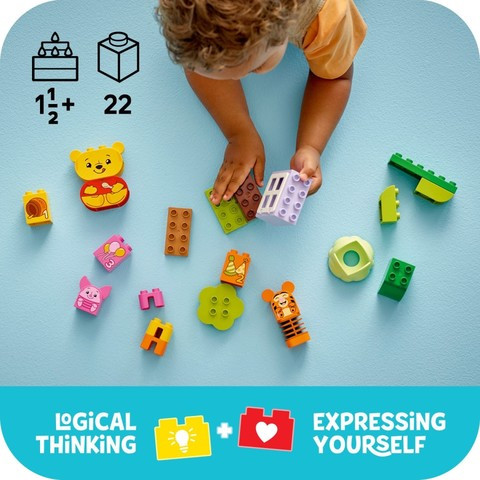 3 играчки-животни LEGO® DUPLO® за конструиране – включва емблематични фигури LEGO DUPLO Disney: Мечо Пух, Тигър и Прасчо, подаръци и конструкция с дървесна къща, за да предизвика забавна игра с въображение;
