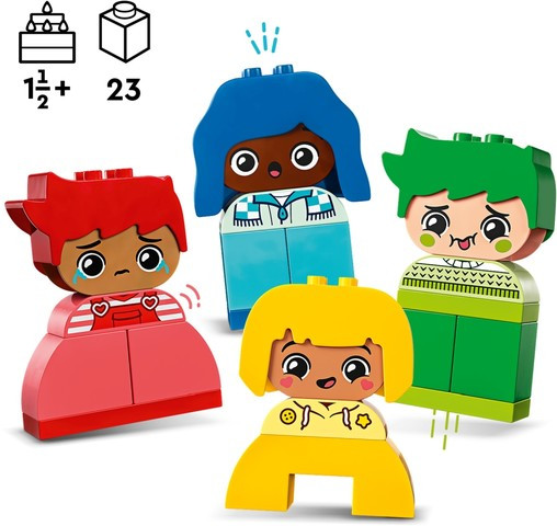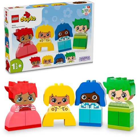 Помогнете на децата да изразяват себе си, докато се забавляват чрез игра с практическия комплект LEGO® DUPLO® Моите първи големи чувства и емоции. Създаден, за да насърчи децата в предучилищна възраст да развият самосъзнание, всеки от 4-мата герои има 2 изражения – щастливо и недоволно – като помагат на възрастни и малки деца да изследват защо понякога всички изпитваме големи чувства.