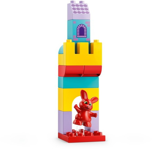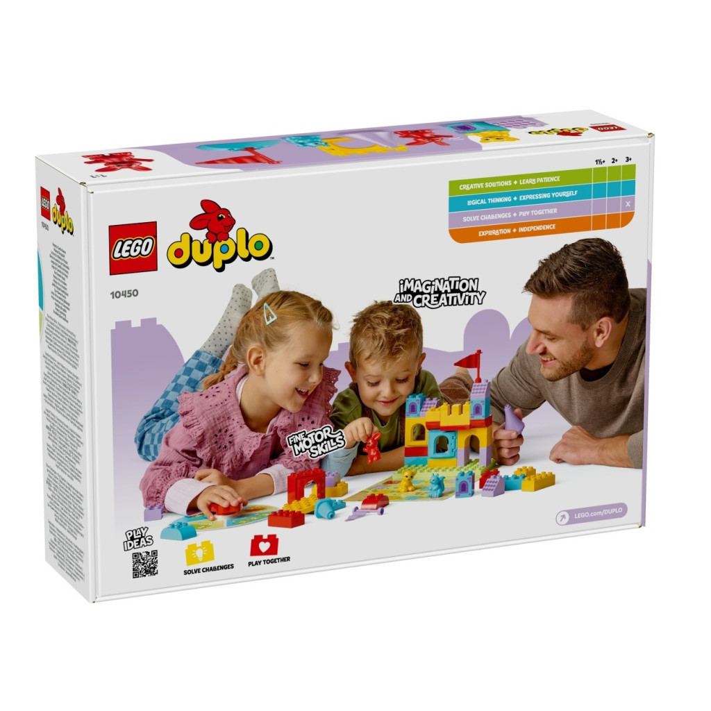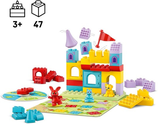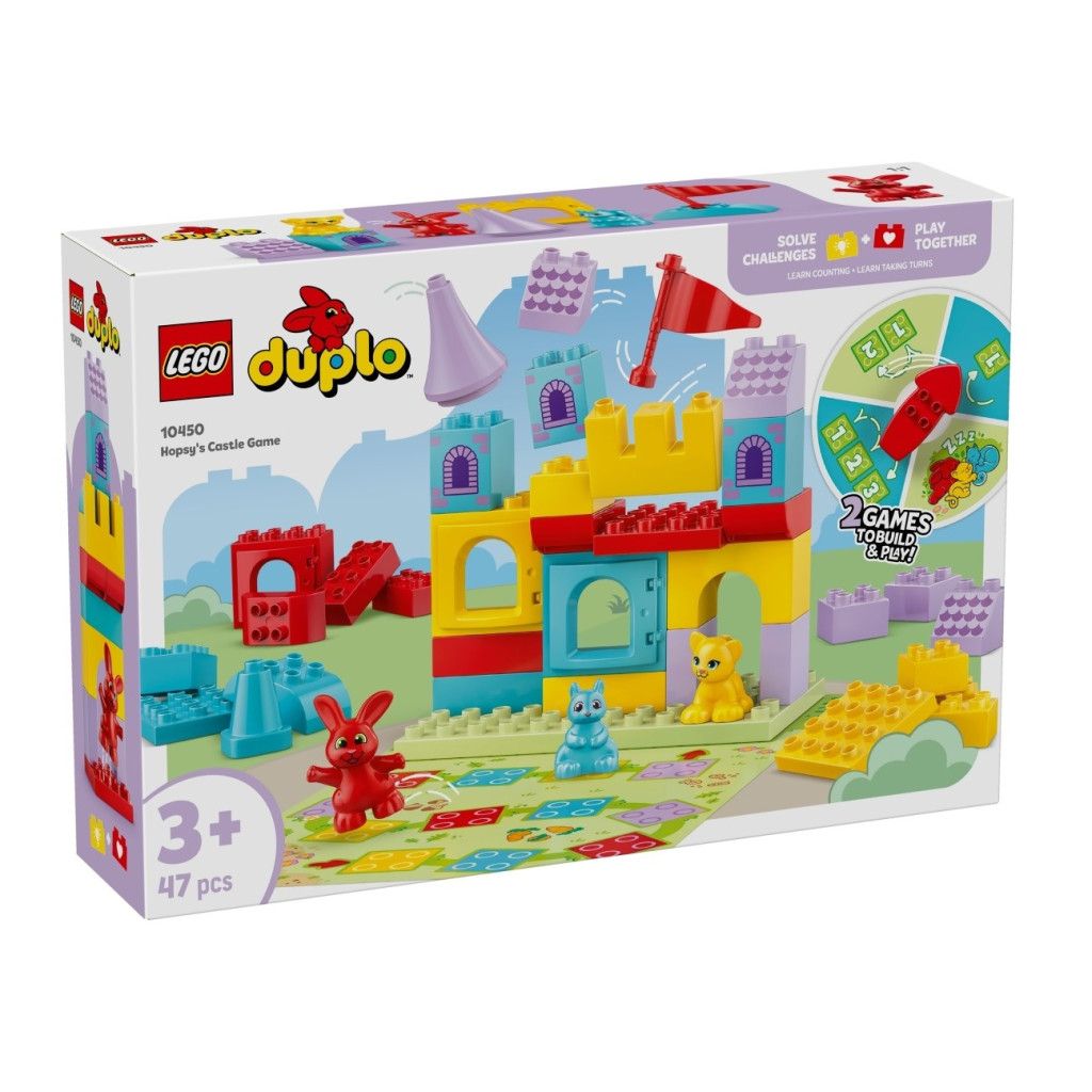 Насладете се на часове семейно забавление с вашето малко дете, докато му помагате да учи чрез игра с настолната игра „2 в 1“ LEGO® DUPLO® Игра в замъка на Скокливка (10450). Малките деца се впускат в учебно приключение с LEGO DUPLO и практикуват умения за броене и сортиране на цветовете, докато играят една от двете забавни игри. Първо малките деца използват умения за цифри и цветове, за да построят креативен замък. Забавните семейни занимания започват като всеки избере животно, след което завърта стрелката, за да види с колко полета на дъската да се придвижи. След това добавят към модела една тухличка с цвета, на който попадне. Играта приключва, когато всички герои пристигнат в замъка. Във втората игра малките деца използват сортиране поцветове, за да видят кой може да построи най-високата кула. Играчите въртят стрелката, за да видят какъв цвят тухличка могат да добавят към своята конструкция. Тази образователна играчка предлага набор от учебни дейности, като разбиране на редуването, въображение и използване на фини двигателни умения за творческо строителство или работа в екип за завършване на замъка. Съдържа 47 части.