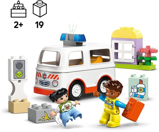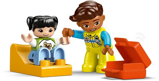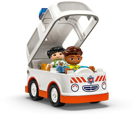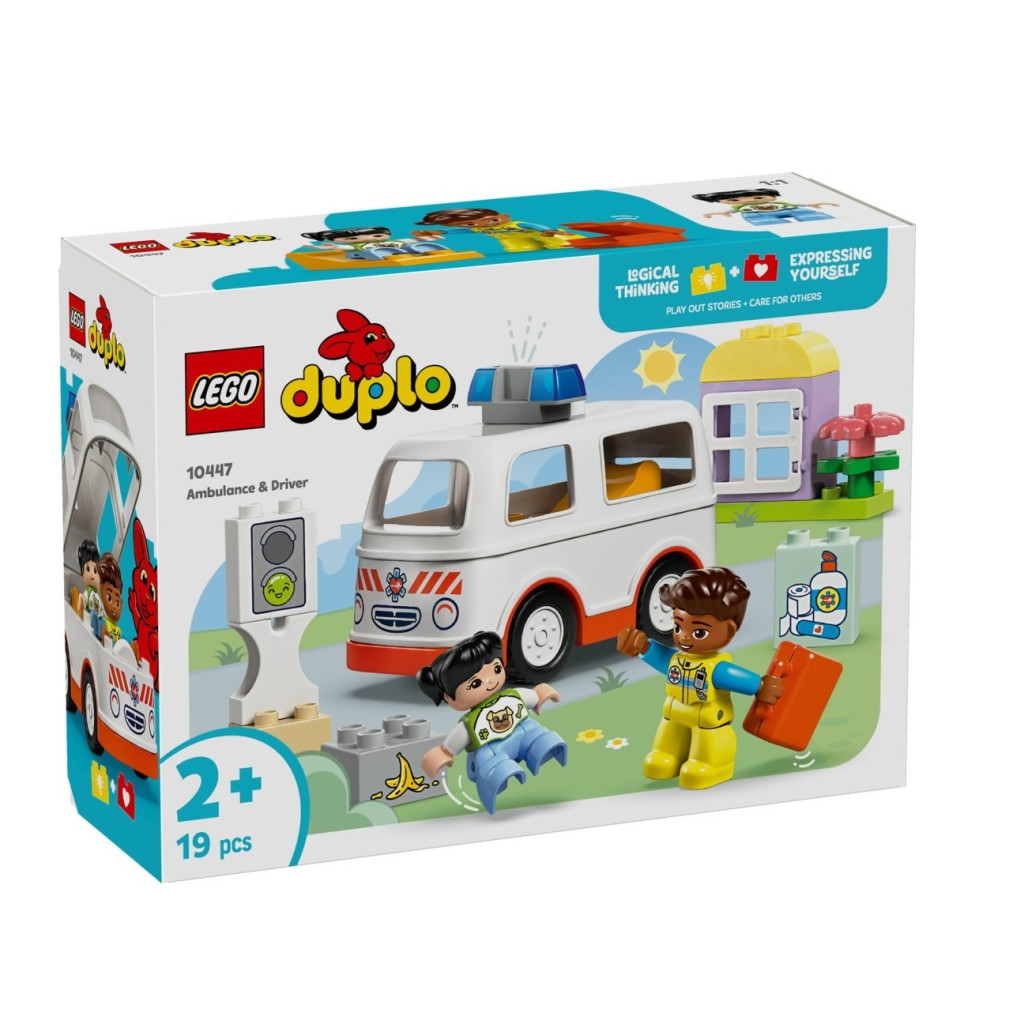 Грижовните мъници разиграват наужким вълнуващи спасителни сцени с играчката „Линейка и шофьор“ (10447) за деца в предучилищна възраст. Тази играчка за малки деца включва подвижна линейка и 2 фигури LEGO® DUPLO®, парамедик и момиче, за творческа въображаема игра. Творческите играчки LEGO DUPLO са страхотен подарък за малки деца, които обичат социални и емоционални учебни дейности, и са предназначени да помогнат на малките деца да се научат на съпричастност. Инструкциите за построяване включват колело за игра, с което родителите и децата в предучилищна възраст могат да изследват различните емоции на момичето. Децата в предучилищна възраст могат да го използват, за да изразят чувствата си относно неразположенията или как са се почувствали, когато за първи път са видели линейка. Те могат също така да развият логическо мислене, за да изградят последователността от събития, и фини двигателни умения, докато отварят покрива на линейката и поставят фигурката на момичето на носилката вътре. Тази образователна играчка за малки деца помага на децата в предучилищна възраст да развият социални умения, докато изследват как шофьорът на линейката би се погрижил за пациента.
