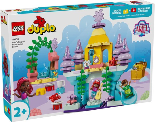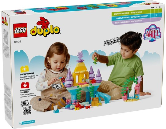 Потопете феновете на Малката русалка на Disney в свят на морски забавления с играчката за построяване LEGO® DUPLO® ǀ Disney Магическият подводен дворец на Ариел (10435). Децата на възраст над 2 години използват логическо мислене и себеизява, за дапресъздават сцени от ТВ сериала Ariel на Disney Junior.Малките деца помагат на LEGO DUPLO фигурата на принцесата на Disney Ариел да се приготви в своята спалня. След това тя се отправя към дансинга, а Фърни и Себастиан свирят на музикални инструменти. Това са само част от многото аксесоари, които вдъхновяват децата да измислят истории за Ариел и нейните приятели. Децата се учат как да създават взаимоотношения с помощта на ролеви игри с героите. Тази образователна играчка за построяване развива и сръчността, докато децата въртят дансинга и бутат подвижната люлка. Подводният дворец на Ариел помага на децата в предучилищна възраст и да упражняват фини двигателни умения и координацията между ръце и очи, докато сглобяват строителните тухлички от комплекта по собствен творчески начин, за да показват творението си с гордост.