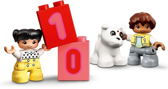 Включва 10 тухлички с числа, превозвани във вагоните на влака за бутане, плюс фигурки на момче, момиче и куче LEGO® DUPLO®, които вдъхновяват въображаема ролева игра.