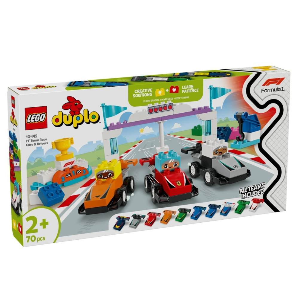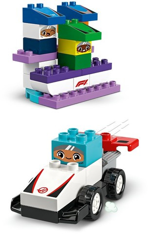 Запознайте малкото си дете със света на Formula 1® с този пълен с функции конструктор LEGO® DUPLO®. Пригответе се за вълнуващи игри, докато вие и вашето малко дете строите и разигравате вълнуващи състезания. Включени са всички отбори от F1®, а децата могат да персонализират колите и да изберат кой шофьор пръв да пресече финала, за да вдигне трофея на победителя на подиума. 5, 4, 3, 2, 1... старт!