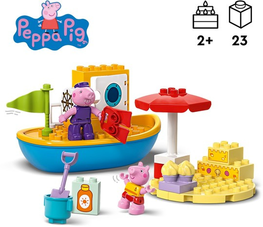 Всички деца на борда за LEGO® DUPLO® Пътуването с лодка на Пепа (10432) и часове забавно учене! Момичетата и момчетата на възраст над 2 години се присъединяват към фигурите на Дядо Прасенце и Пепа на плажа за пътешествие с лодка. Тази играчка за построяване и промяна идва с много творчески аксесоари, които да вдъхнат въображение за разказване на истории на малките деца. Те помагат на Пепа да си сложи слънцезащитен крем преди да се отправи на лов за мидички и усъвършенстват своите умения за подреждане, докато построяват пясъчния замък. Ако слънцето е твърде силно, Пепа може да се скрие под чадъра или да поплува, а децата упражняват своята координация между ръце и очи и фините двигателни умения, докато ѝ помагат да си сложи плавниците. Децата също могат да се разхладят във водата: този комплект с лодка плава, така че те могат да се радват на часове весело плискане с тази водна играчка. Играчките LEGO DUPLO с Пепа за деца са предназначени да подпомогнат ученето в предучилищна възраст, като помагат на малките деца да мислят логически и творчески, докато изграждат историята и имитират сцени от ТВ сериала.