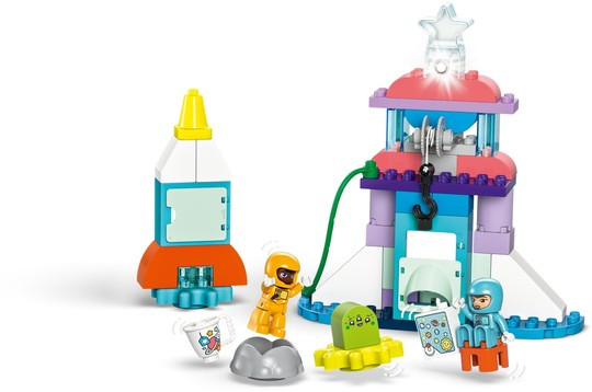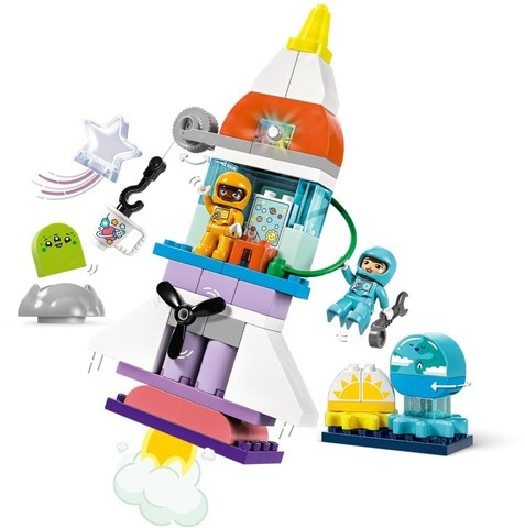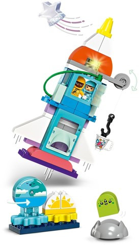 Космическата играчка има множество забавни аксесоари, за да стимулира творческа игра. Децата в предучилищна възраст изследват нови хоризонти, докато измислят забавни приключения в космоса за 2-те фигури на астронавти от LEGO® DUPLO®, като например да се сприятеляват с извънземно или да тръгнат на космическа разходка, за да поправят ракетата със своя гаечен ключ.