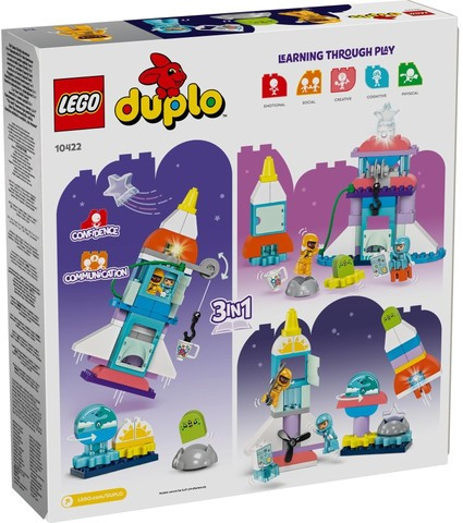 3… 2… 1… изстреляйте се в изпълнена с дейности игра с играчката за построяване и промяна „Приключение с космическа совалка „3 в 1“ (10422). Въображението се развихря, докато малки деца на възраст 3+ си играят на астронавти, като изследват галактиката с космически кораб, срещат се с извънземни и научават за слънчевата система.