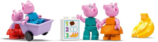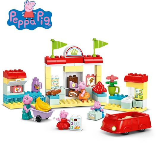 Помогнете на момичетата и момчетата над 2 години да разиграят пътуване до магазина с играчката LEGO® DUPLO® Супермаркет с Пепа (10434). Децата в предучилищна възраст стават част от семейството, тръгнало на пазар за храна в емблематичната червена кола от ТВ сериала. Тази играчка за построяване и промяна включва много аксесоари, които стимулират творчески ролеви игри. С 4-те фигури – Пепа, Джордж, Мама Прасенце и Татко Прасенце – децата могат да си представят, че са както родителите, така и децата. Те ще разпознаят предмети от истински хранителни магазини като например касата на самообслужване, количката и фризера. Тази играчка за обучение LEGO DUPLO с Пепа за деца в предучилищна възраст помага за развитие на умения, докато децата мислят логически при разиграването на пазаруване, вдъхновено от ТВ сериала. Чрез играта семействата могат да изследват и емоциите. Тази позната сцена ще насърчи разговори между децата и възрастните за това как да се държим в магазина и – най-вече – кой да бута количката!