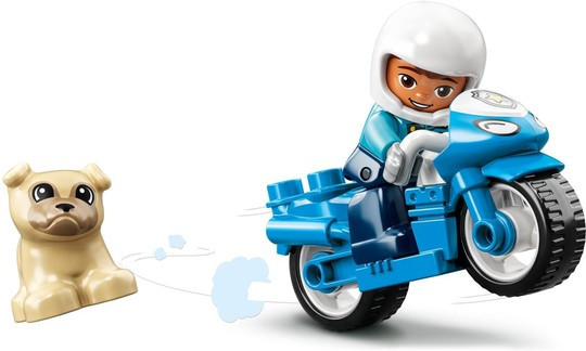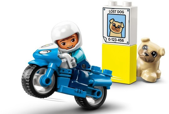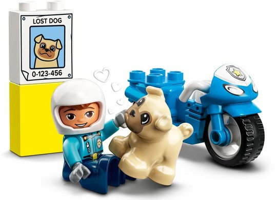Вдъхновява за игри с въображение – Комплектът включва 2 фигури LEGO® DUPLO® – полицай и сладко кученце, плакат „Изгубено куче“ и страхотен син полицейски мотоциклет, на който да се возят полицаят и кучето;