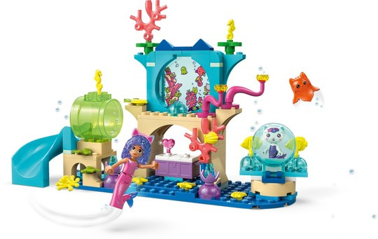 Гмурнете се в подводно приключение с Gabby, MerCat и многоцветни медузи! Gabby е облечена като русалка и е готова да изследва цветния аквариум, пълен с миди, растения и очарователен морски създания. Присъединете се към приятелите, докато се спускат по пързалката и плуват в гигантски балон, след което търсят миди и преместват корала, за да намерят скрит сандък със съкровища – точно като във филма!