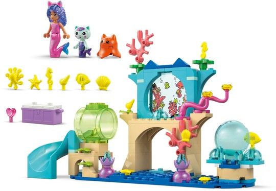Играчка от Gabby’s Dollhouse: The Movie за игра с въображение – тази подводна играчка включва миникукла на Gabby в облекло на русалка, фигури на MerCat и медузи плюс начална тухличка за бързо сглобяване;