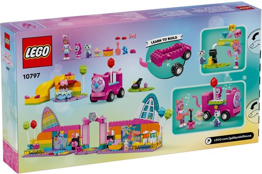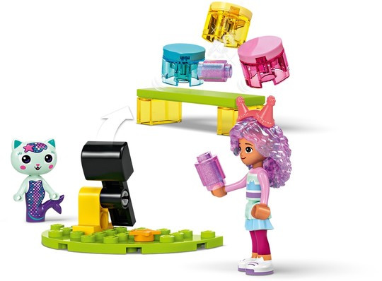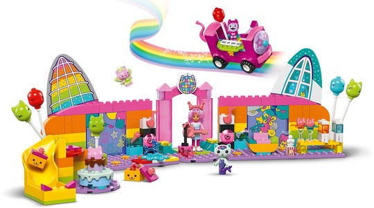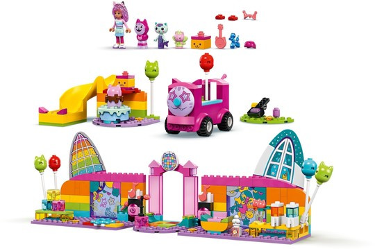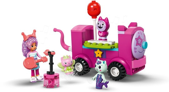 Парти стаята на Gabby (10797) е върховният диско комплект за фенове на Куклената къща на Габи на DreamWorks Animation. Тази забавна играчка развива увереност, концентрация и умения за решаване на проблеми у деца в предучилищна възраст над 4 години. Тази играчка за момчета и момичета е комплект за диско парти и не само! С Габи, Даниел Джеймс „Диджей“ Котьо, Котешката фея и Котка-русалка, различни играчки за музикално парти – включително парти бус за бутане с вграден синтезатор, въртящ се дансинг, китара, 2 микрофона и блестяща диско топка – сцената е готова за безкрайни игри с въображение! Аксесоарите включват балони и кънки за дискотеката, пуканки и 2 чаши със скрежина за зоната за почивка, както и катапулт и консерви за събаряне. Има торта за Габи и подаръци, доставени по пързалката. В комплекта има голяма начална тухличка, с която децата да започнат да строят. Ръководство с картинки и история предлага интуитивни инструкции.