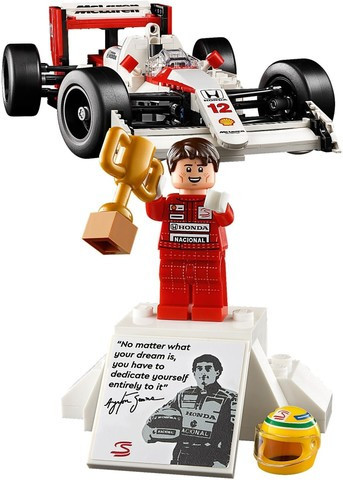 Украса за бюро за дома и офиса – включва стойка за показване на McLaren MP4/4 с отпечатана статистика за превозното средство и подиум за показване на минифигурата на Айртон Сена със снимка и емблематичен цитат на Сена;
