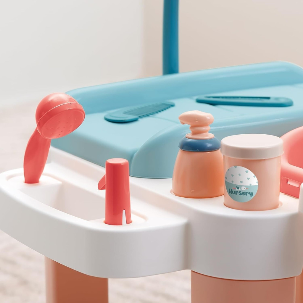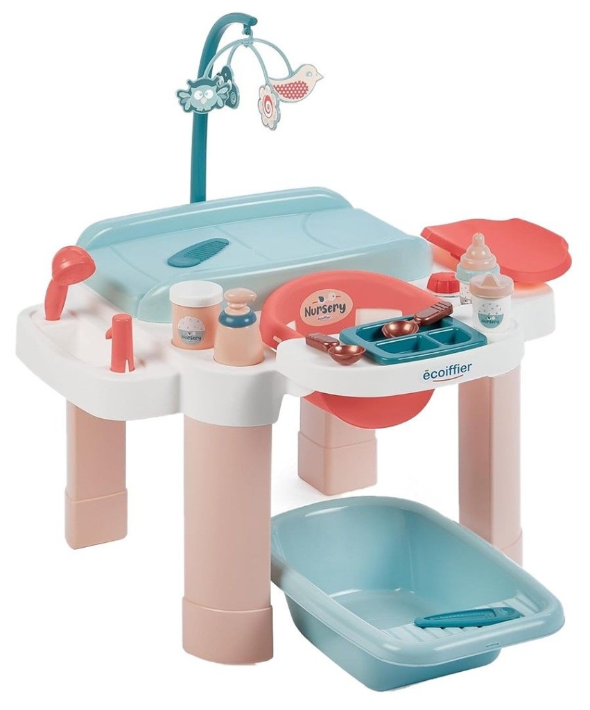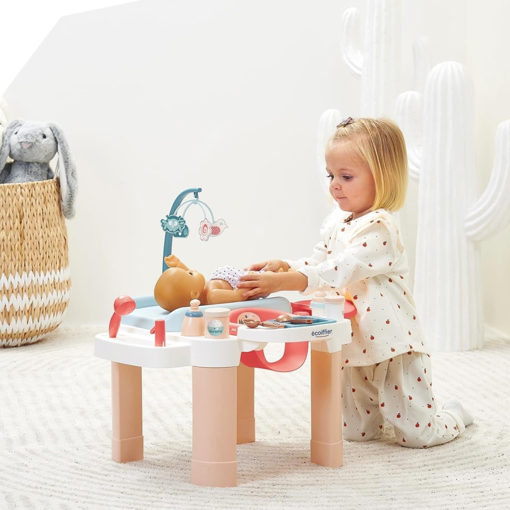 Комплектът кът за грижа за кукли от Ecoiffier е перфектен избор за малките грижещи се родители. Той предлага всичко необходимо, за да могат децата да се потопят в света на ролевите игри и да се грижат с внимание и любов за своето бебе. Детската станция за грижа включва маса за повиване с мобил, вана, кантар и столче за хранене – пълно оборудване за ежедневна грижа. Под повивалната масичка има и пространство за съхранение, където всички аксесоари могат да бъдат подредени и винаги под ръка. Благодарение на заоблените си форми, комплектът е безопасен и подходящ за деца над 18 месеца, като насърчава въображението, грижовността и социалните умения. Изработен от висококачествена и устойчива пластмаса, този комплект съдържа 13 елемента, включително вана, маса за повиване и мобил, както и шише, гребен, термометър и други имитационни аксесоари.