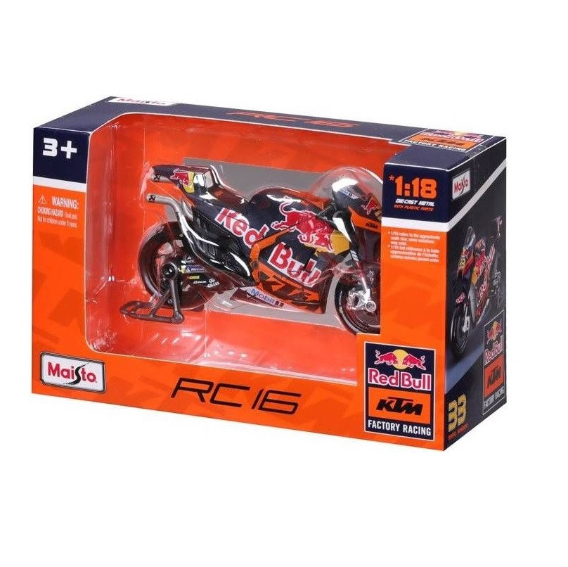 Мотоциклетът KTM RC16 от Maisto представя официалния модел в мащаб 1:18, с който Brad Binder (#33) се състезава за отбора на Red Bull KTM Factory Racing през сезон 2023 на MotoGP. Той е изработен от метална сплав с високо качество и детайлни пластмасови елементи, които възпроизвеждат автентичния дизайн на състезателния мотоциклет.