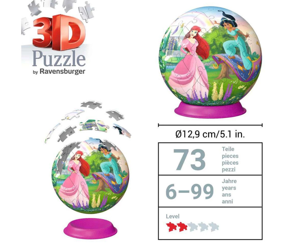 Ravensburger - 3D Пъзел Топка 72 ел. - Дисни принцеси, Ravensburger Puzzle Disney Princess, 13 x 13 cm,11579
