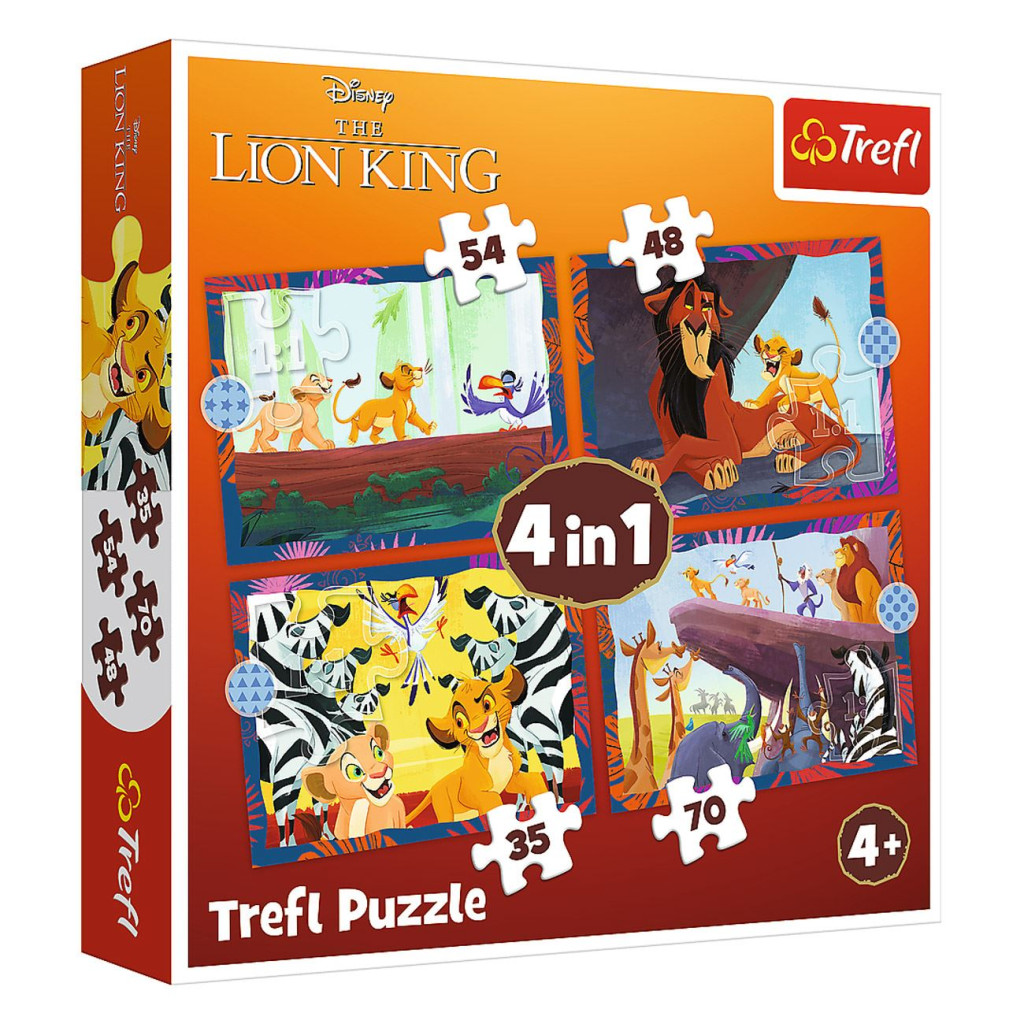 етски пъзел с 4 илюстрации от света на Царят Лъв и приятелите му. Съдържа 4 пъзела с различна трудност – 35, 48, 54 и 70 части.