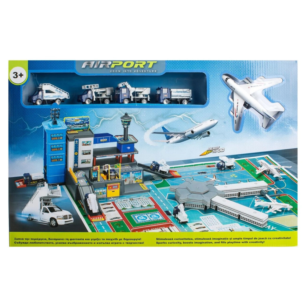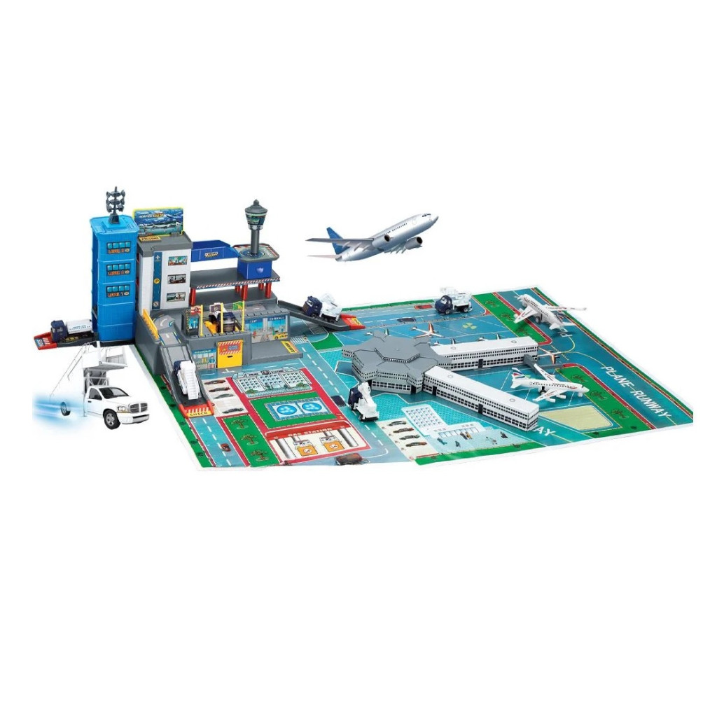 Съдържа многоцветен килим с писти, кули и терминали за изследване, трасета и паркоместа за супер маршрути.