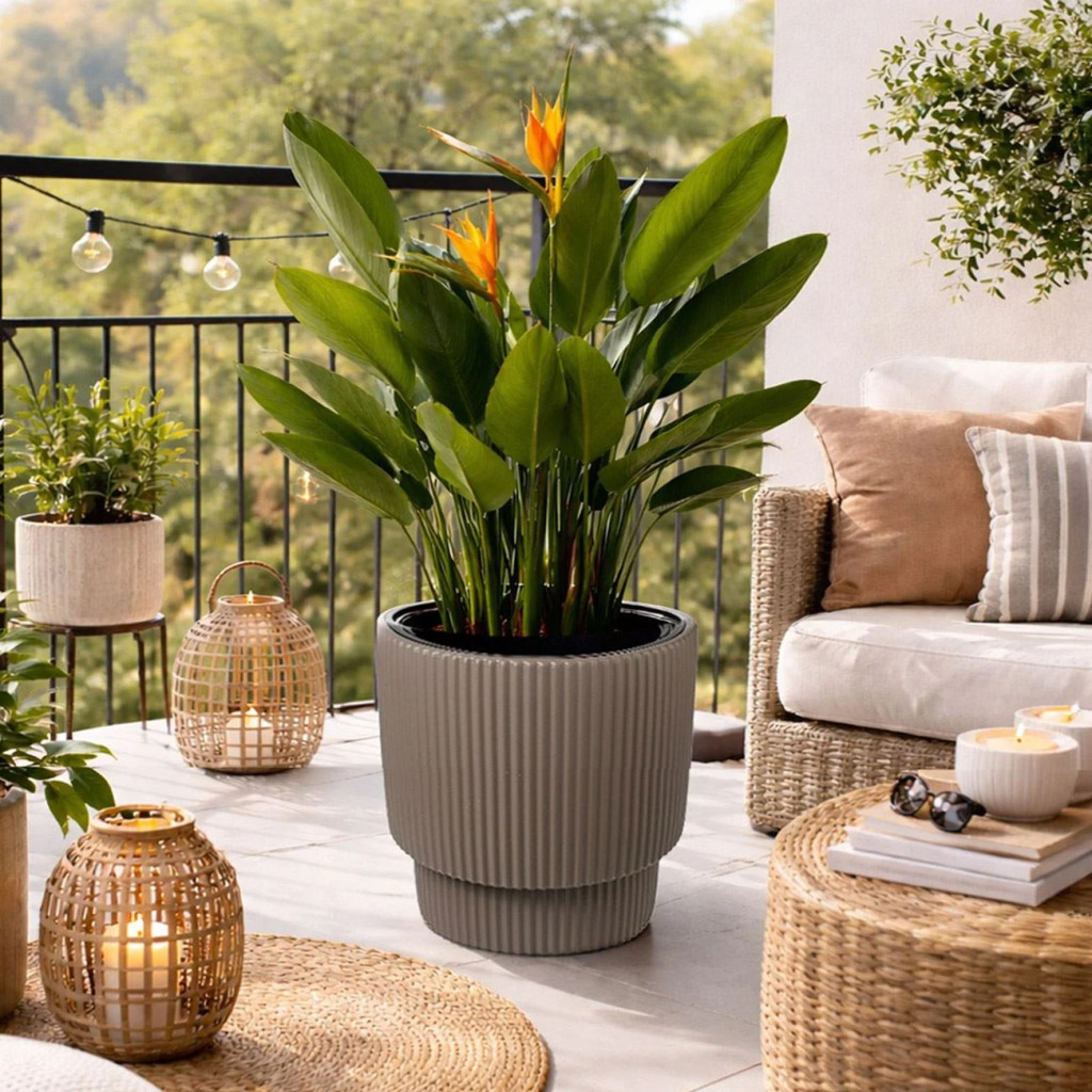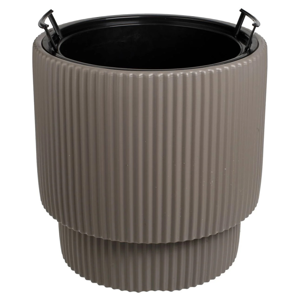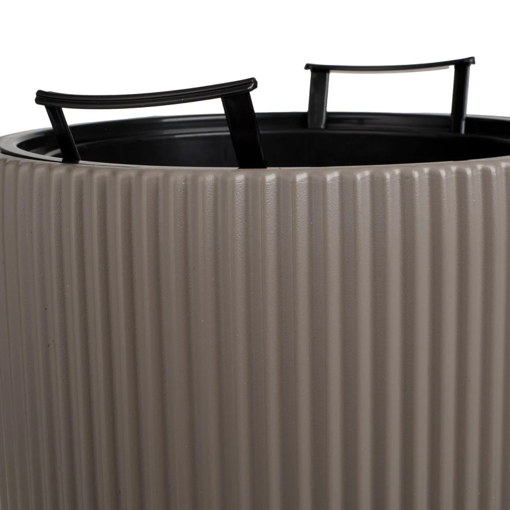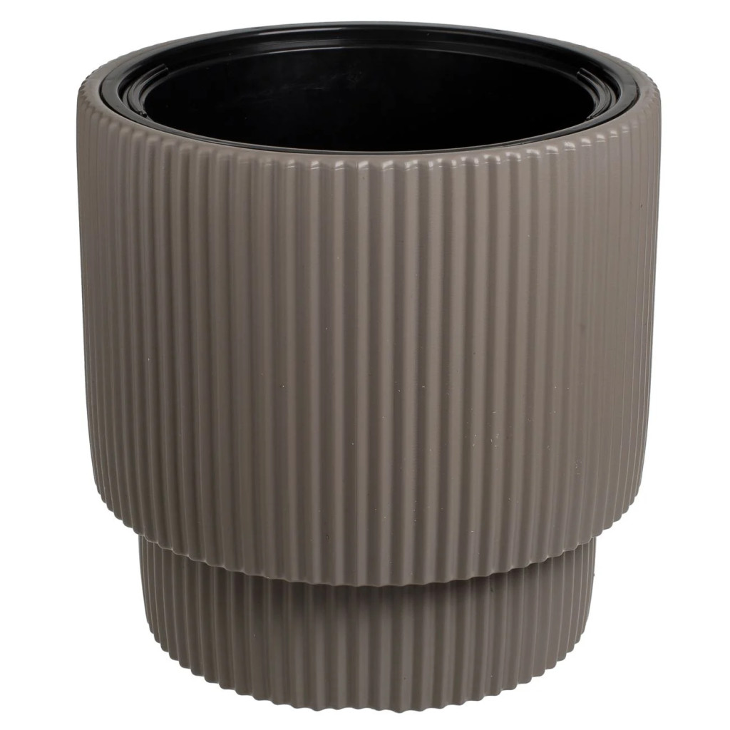Тази модерна декоративна саксия е идеалният избор, за да обновите визията на вашето външно или вътрешно пространство. Със своя елегантен и съвременен дизайн тя подчертава всяко растение, като създава усещане за лукс и спокойствие. Минималистичният ѝ стил с естетична релефна повърхност с райета (grooved texture) по цялото тяло придава дълбочина и визуален интерес на крайния резултат. В неутрален мока цвят, който се съчетава перфектно с всеки интериорен стил – от индустриален до скандинавски. Дизайнът включва леко стеснена основа, създаваща впечатление, че саксията е „повдигната“, което ѝ придава по-лека и модерна силуетна линия. Вътрешно разполага с допълнителен контейнер с дръжки, в който можете да поставите растение без голяма коренова система.