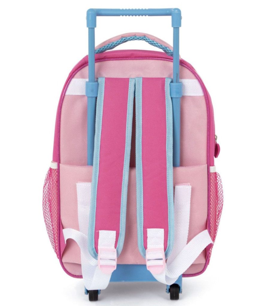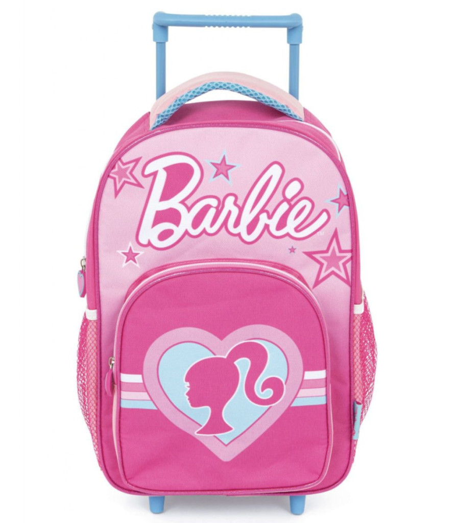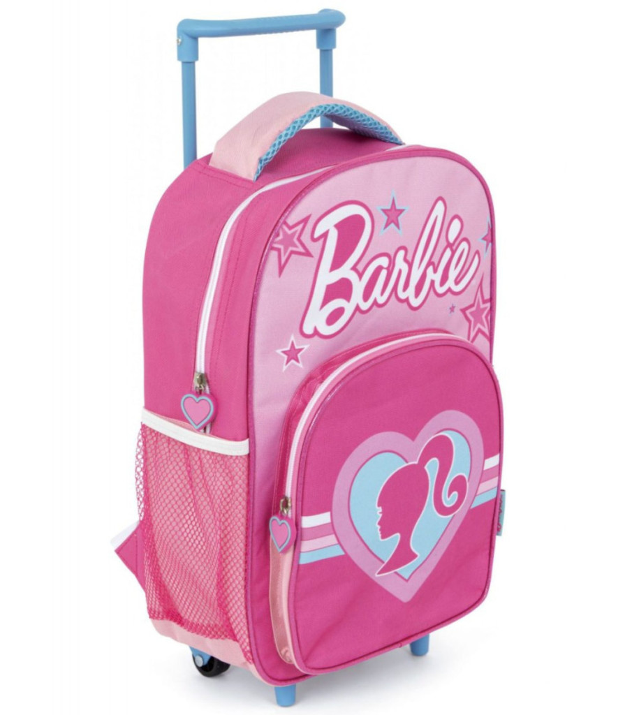 Розова раница Барби, изработена по европейски дизайн, на испанския производителArditex. С колелца, телескопична дръжка, малка дръжка за носене в ръка и презрамки за носене на гръб. С едно основно отделение с цип, преден джоб с цип и два странични джоба с мрежа. Идеалната първа раница за детска градина или училище. Опаковка: полиетиленов плик. Подходящо за момичета над 3 години.