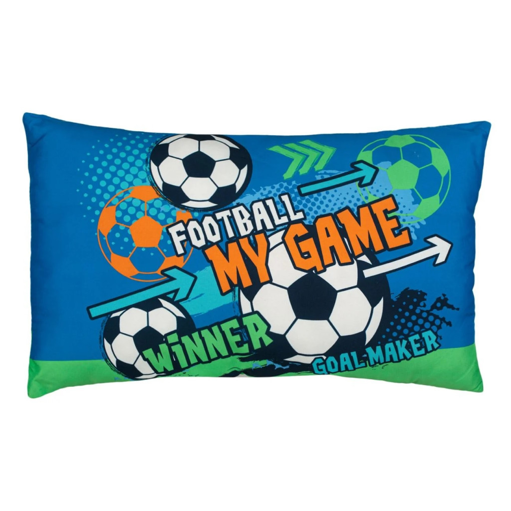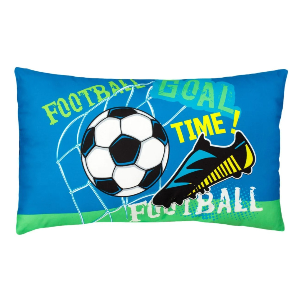 Декоративна възглавница за момче, в син цвят с футболен мотив и две различни страни, без цип.