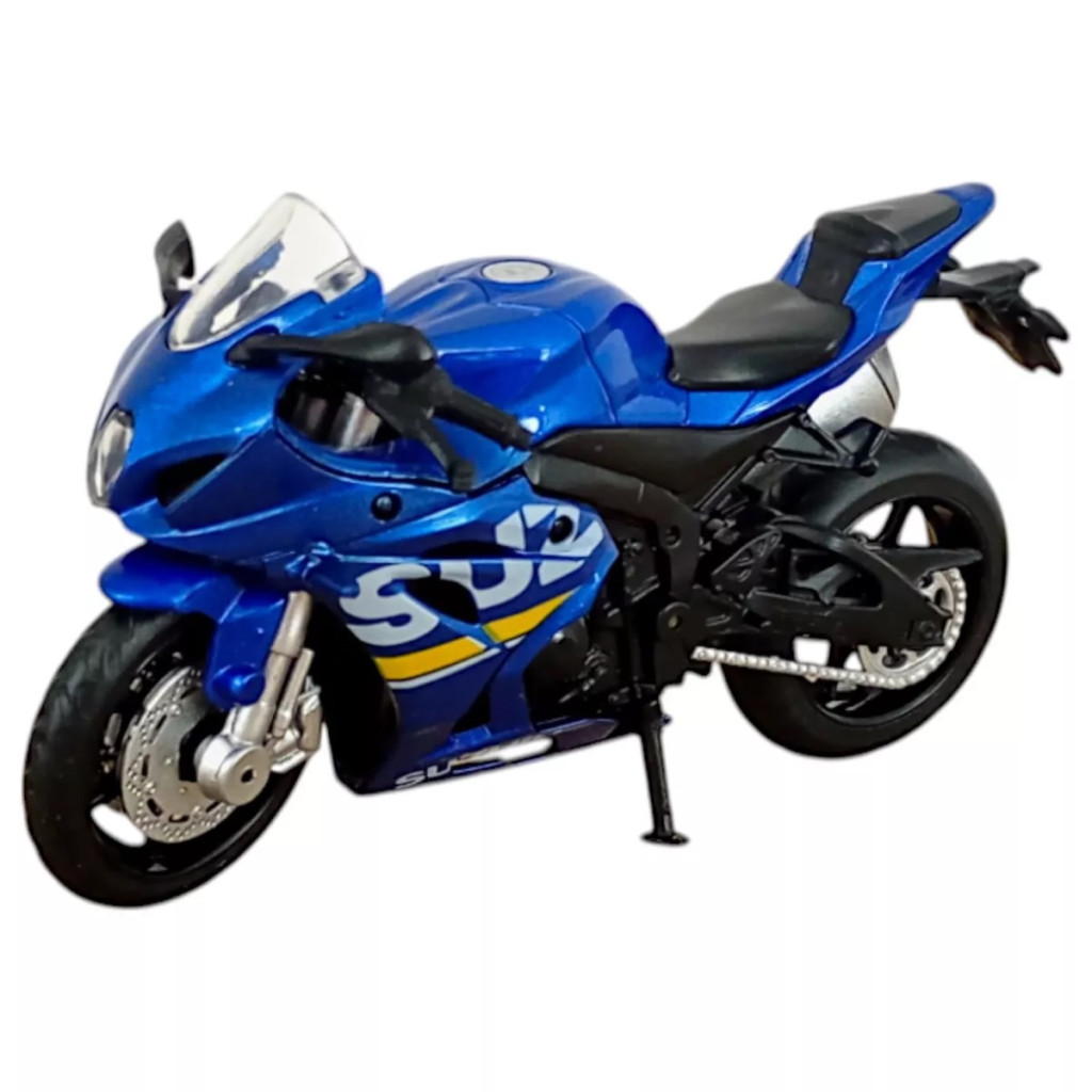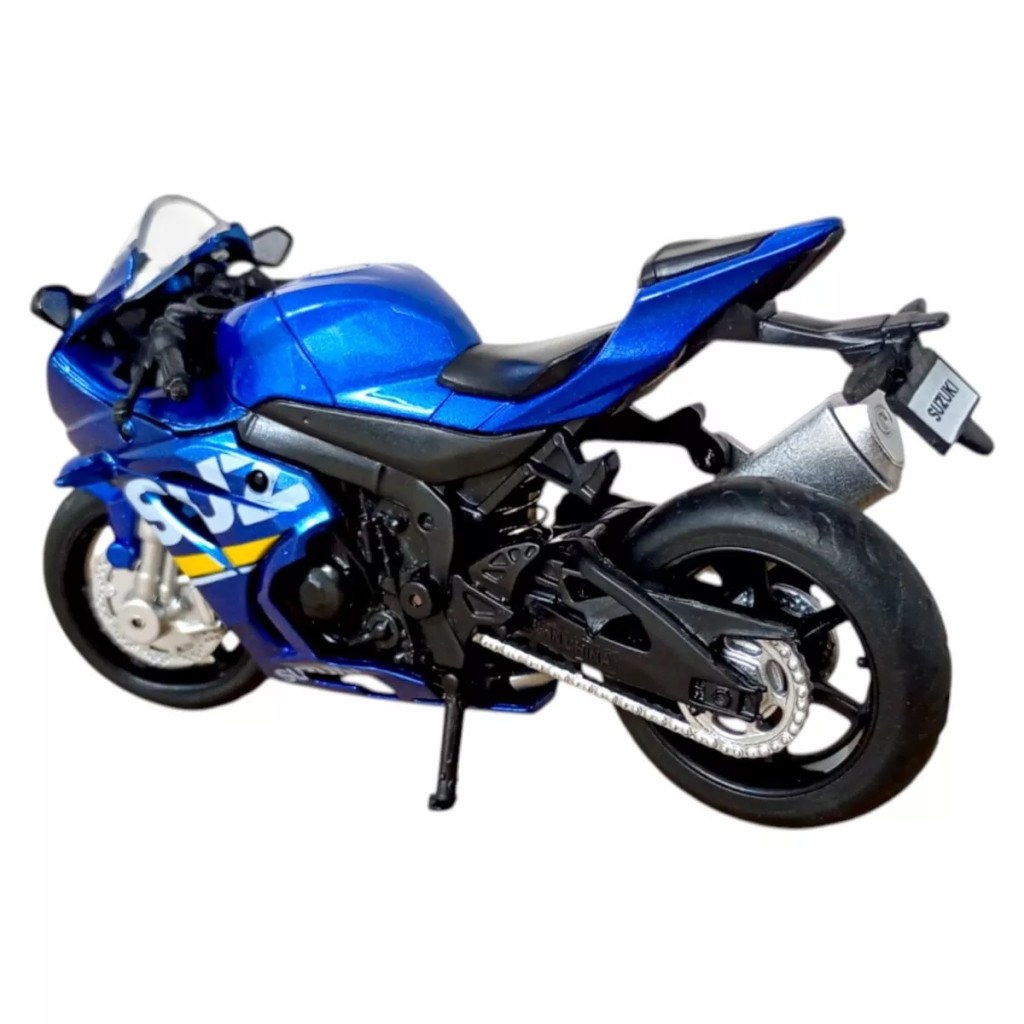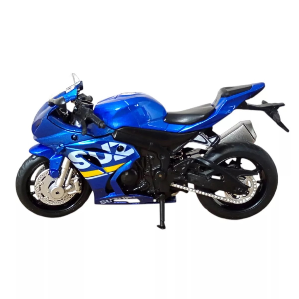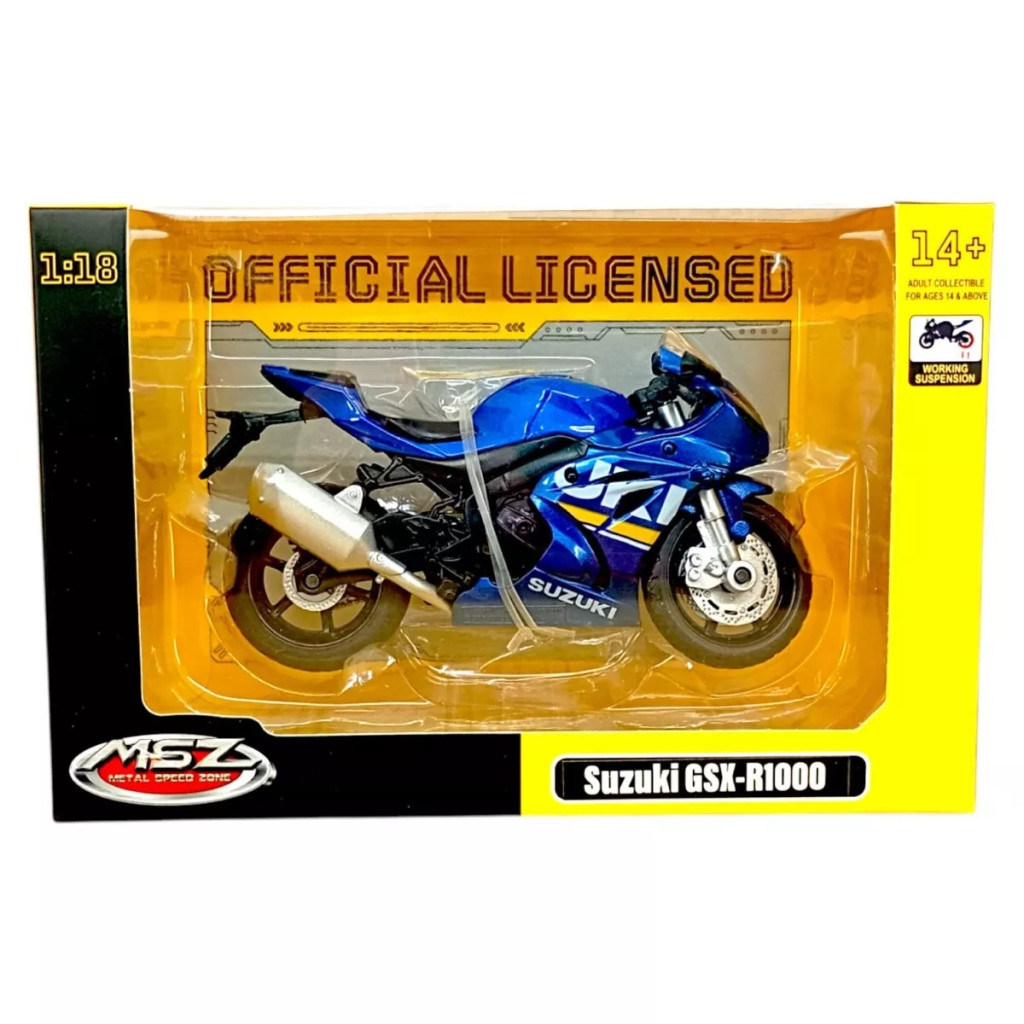 Изображението показва умален модел на мотоциклет SUZUKI GSX-R1000 в мащаб 1:18.