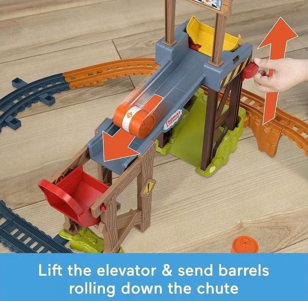 Повдигнете асансьора, за да изпратите варелите да се търкалят по улея до товарача, където Дизел и камионът Troublesome могат да ги вземат отново.