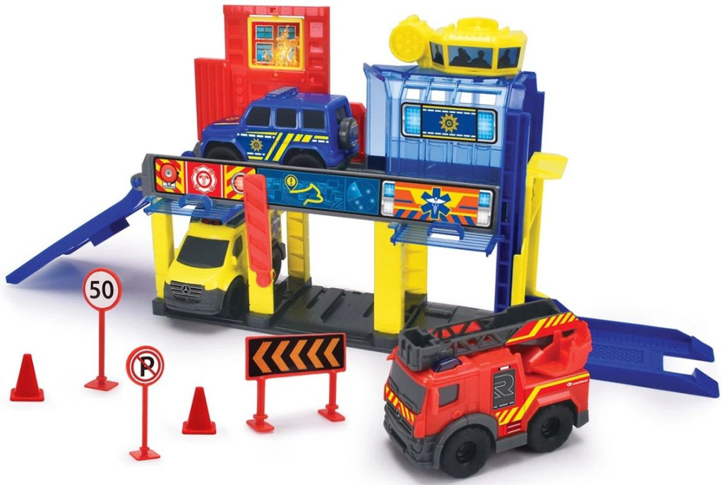 Dickie Toys - Micro SOS автомобилна станция - спасителна станция с 3 играчки коли Mercedes-Benz (полицейска кола, пожарна и линейка), функции и аксесоари за игра, играчка за деца над 3 години. "Micro SOS станцията" предлага на малките спасители над 3 години всичко необходимо за техните мисии - всичко на едно компактно място! Двуфасадният гараж комбинира полицейска станция, пожарна и спешна линейка и идва с подходящите спасителни превозни средства. С помощта на ръчния асансьор децата лесно могат да транспортират своите превозни средства на горния етаж, където ги очакват наблюдателна кула и функция за стартиране с рампа за бързи мисии. Веднага щом постъпи спешен сигнал, вратите се отварят и колите се устремяват към мястото на инцидента! Три обозначени паркоместа в гаража осигуряват всяка играчка кола да има своето място и играчката да е винаги подредена - готова за употреба по всяко време! Комплектът съдържа три официално лицензирани миниатюрни превозни средства Mercedes-Benz (по 8 см всяко): червена пожарна кола Mercedes-Benz Antos, синя полицейска кола Mercedes-Benz G-Class и жълта линейка Mercedes-Benz Sprinter. Тези три здрави играчки са идеалното допълнение към станцията. Снабдени със свободно въртене на колелата и подвижна стълба на пожарната кола, тези детски автомобили са готови за всякакви вълнуващи приключения - допълнени от аксесоари за игра като пътни знаци и конуси, които вдъхновяват децата да разказват креативни приключенски истории.