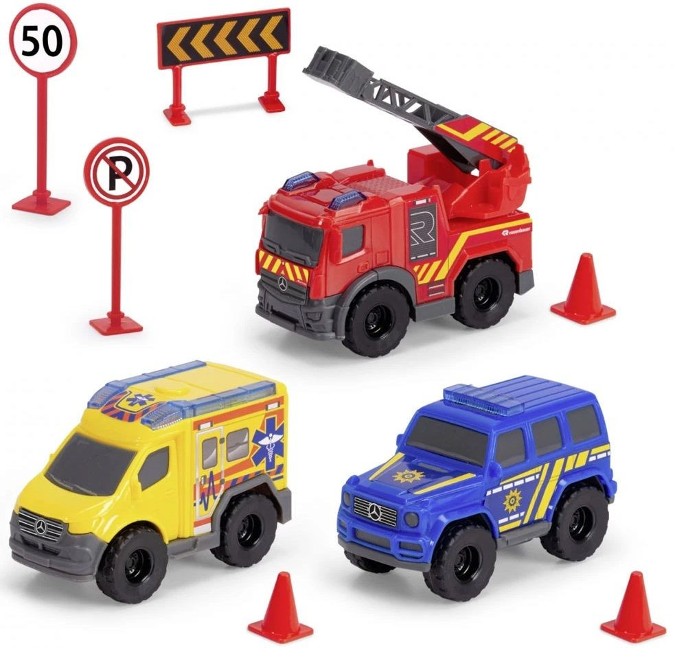 Комплектът съдържа 3 официално лицензирани модели на превозни средства Mercedes-Benz с функция за свободно въртене на колелата: пожарна кола Mercedes-Benz Antos, полицейска кола Mercedes-Benz G-Class и линейка Mercedes-Benz Sprinter;