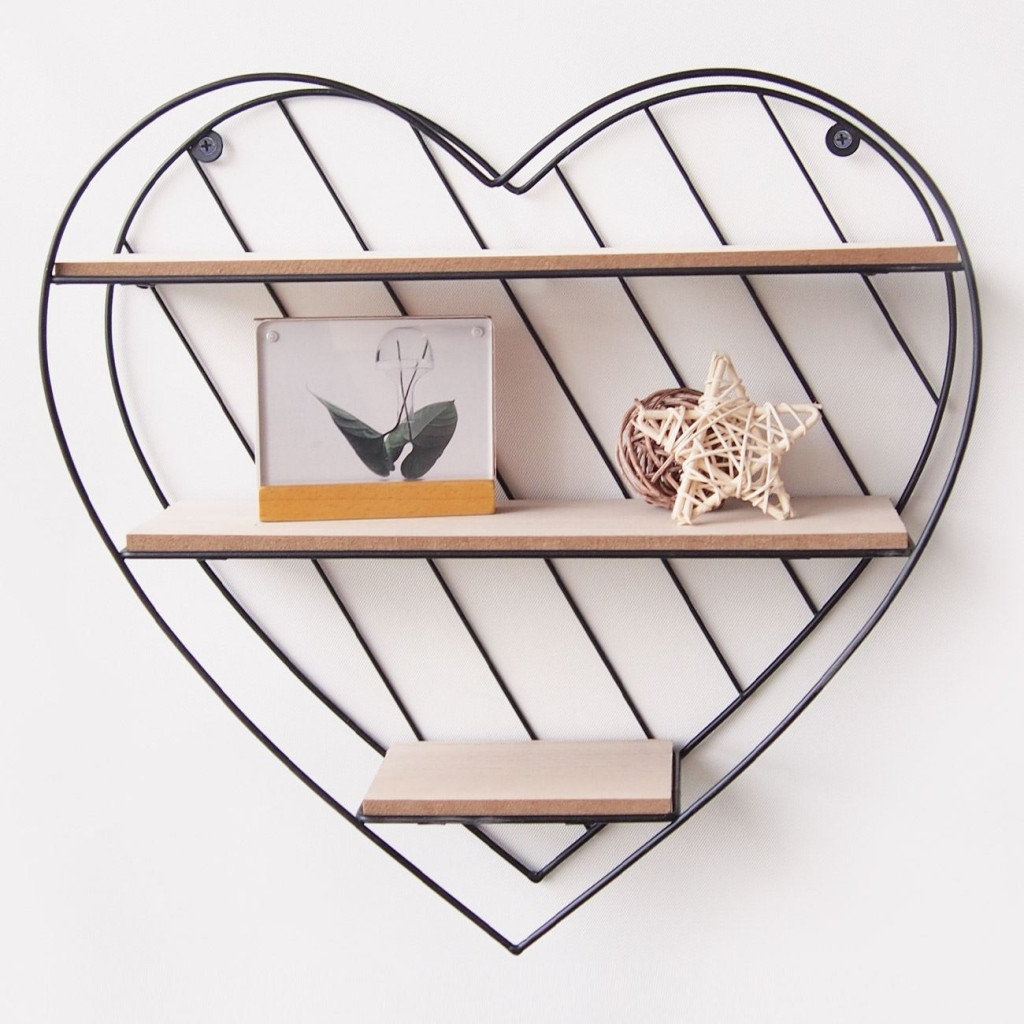 Универсален рафт за стена, Форма Сърце, 3 нива, Метал и дърво, 33.5 х 9.5 х 32 cm