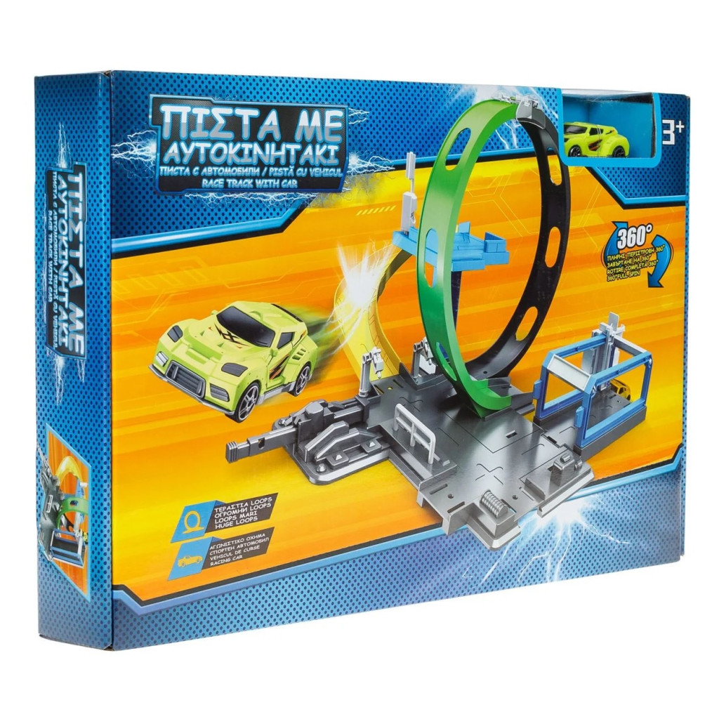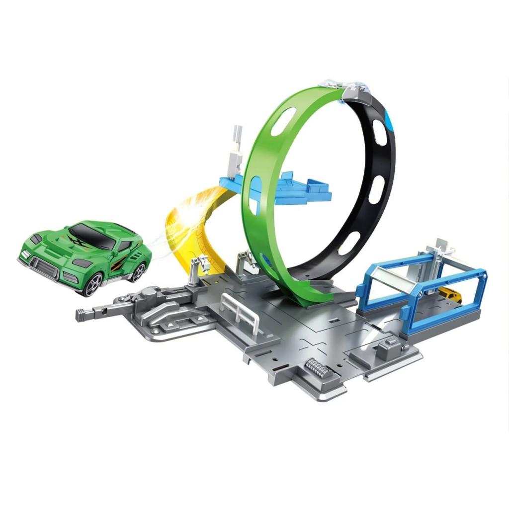 Писта с изстрелвач и големи лупинги за пълно завъртане на 360 градуса и състезателно превозно средство.