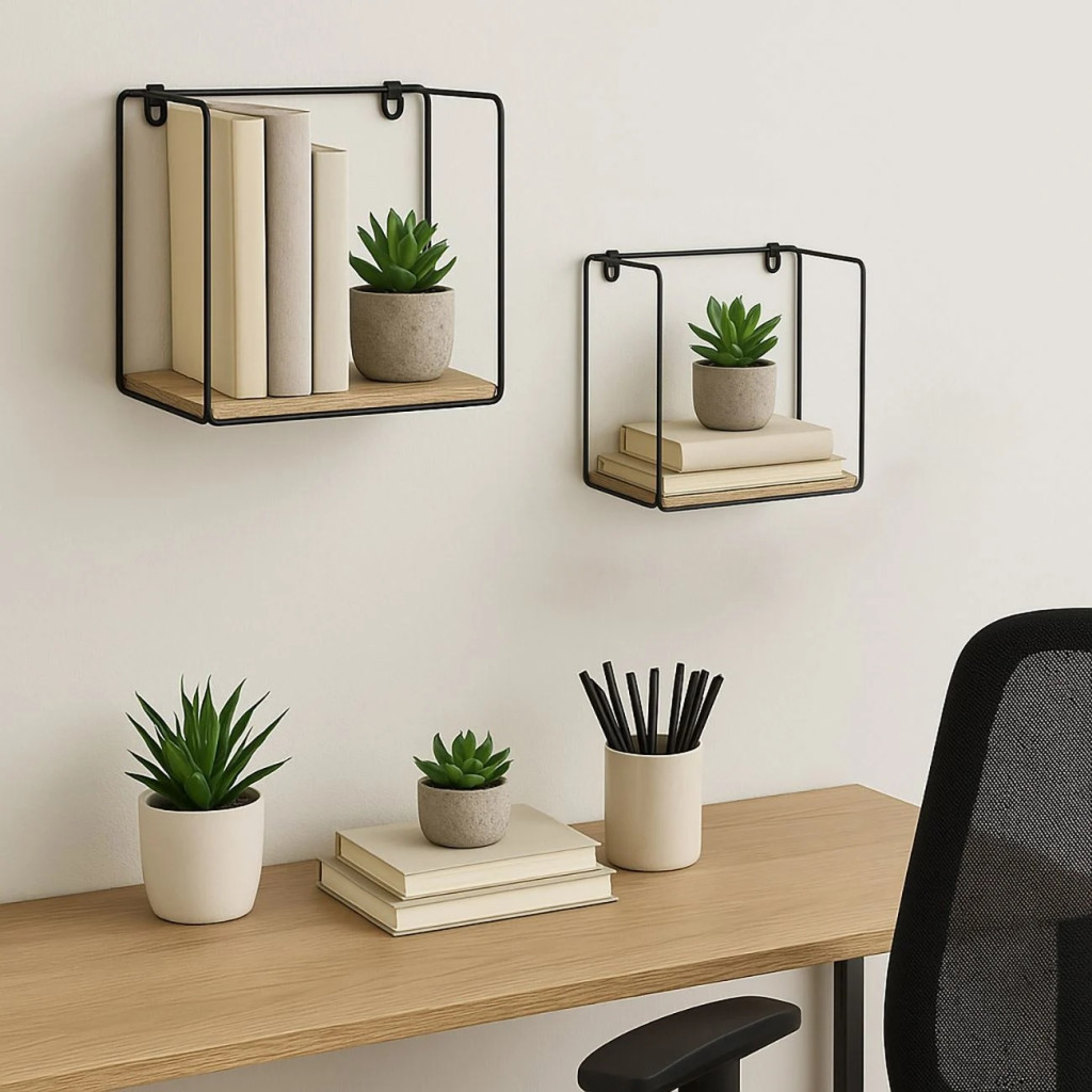 Декоративни рафтове с метална мрежа на рамката и дървена (MDF) основа.
