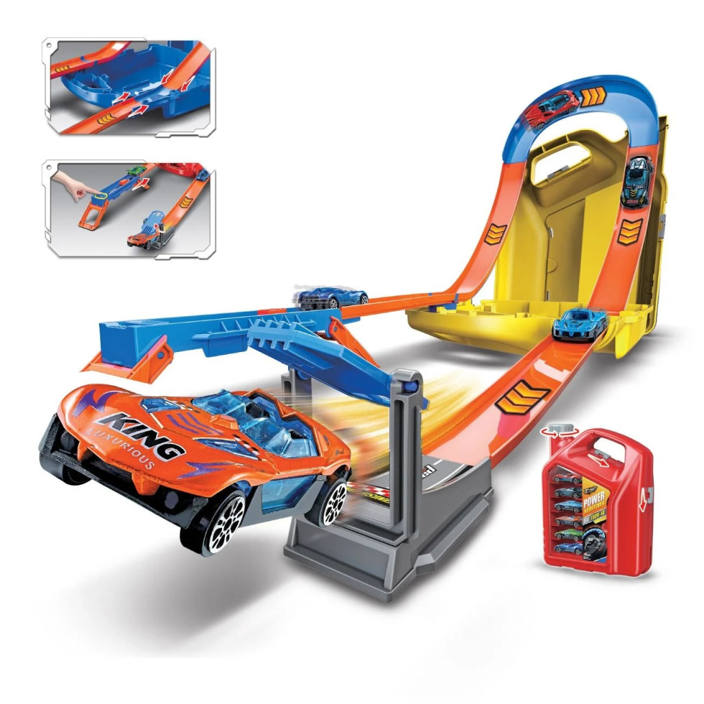 Писта, която се сгъва в бидон и при отваряне се превръща в писта с две уникални U-образни писти и лупинг.