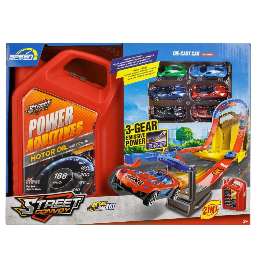Писта - куфарче под формата на туба за масло с 6 превозни средства