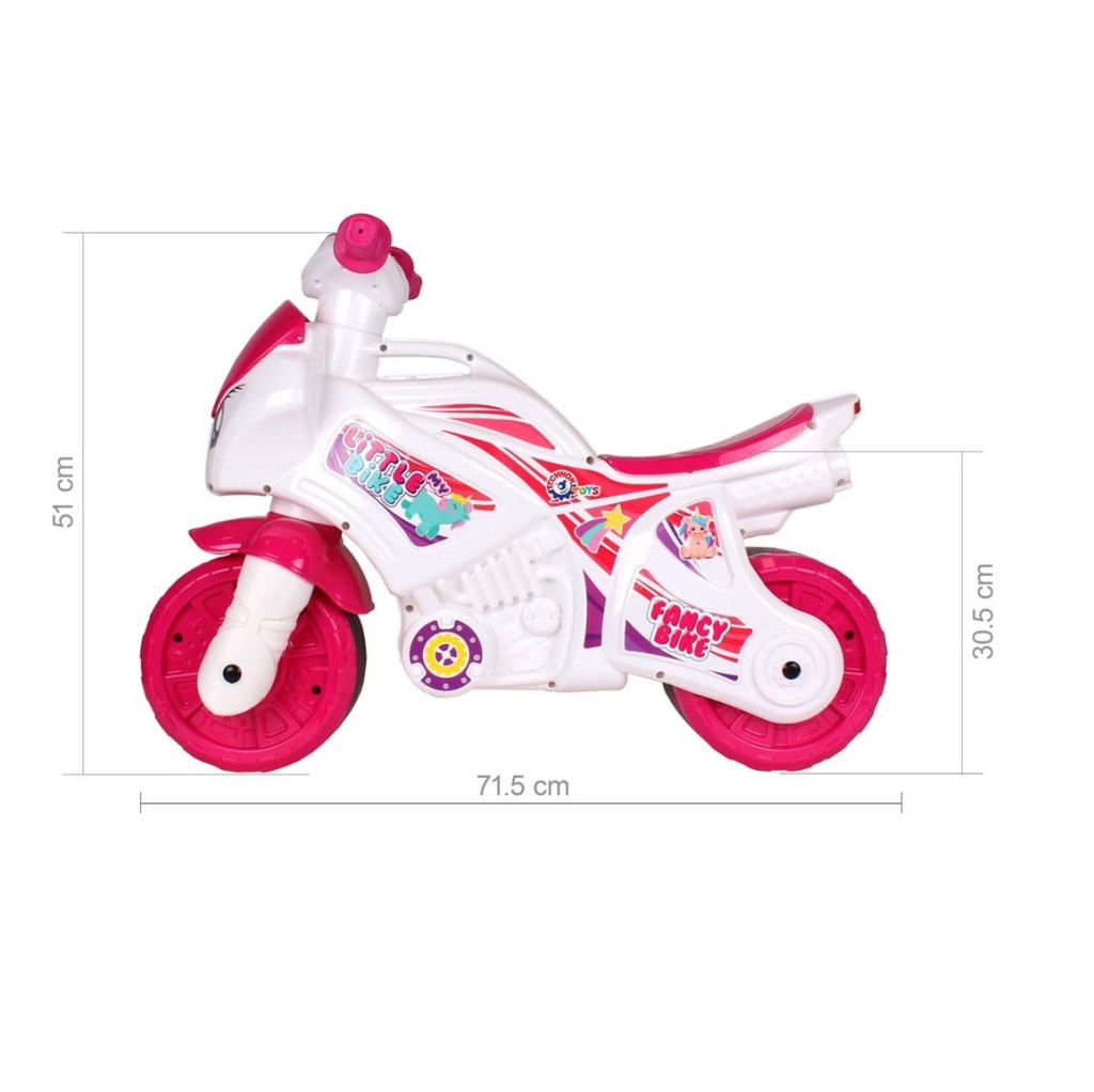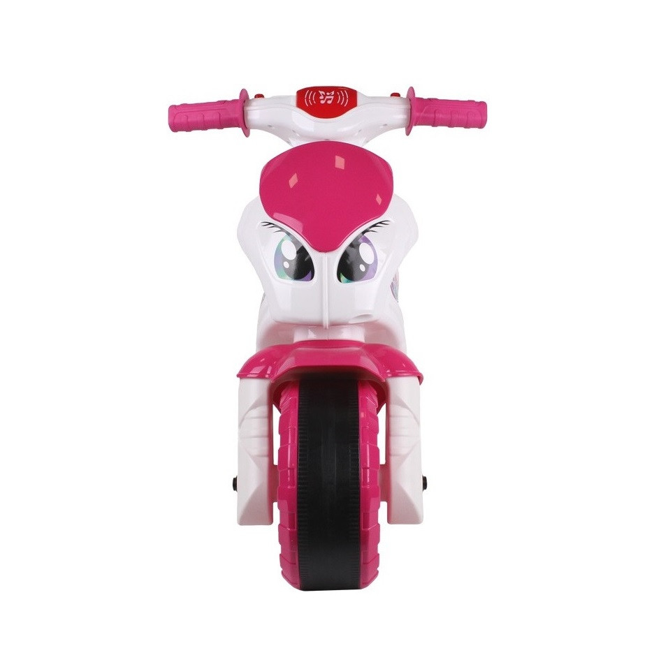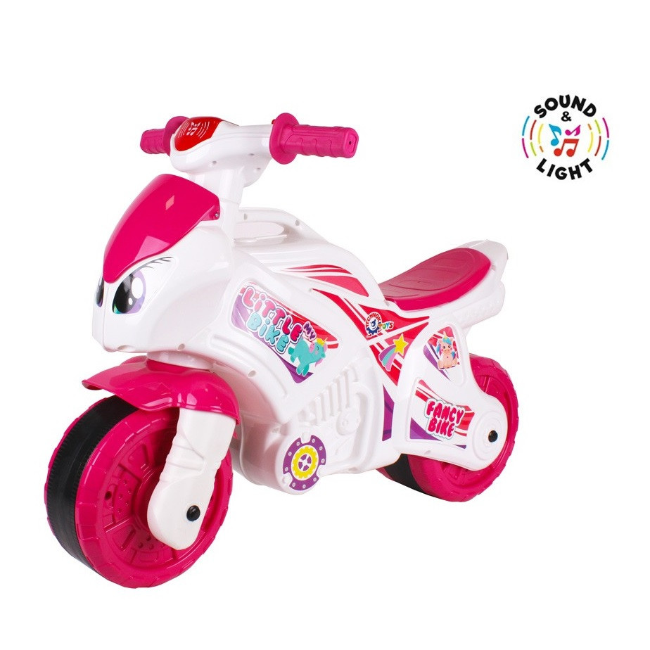 Мотоциклетът има два бутона, които при натискане издават различни звуци. Ярката "весела" светлина, която се появява, когато щракнете върху един от бутоните, със сигурност ще предизвика интерес и истински ентусиазъм. Мотоциклетът е декориран със сладки стикери.