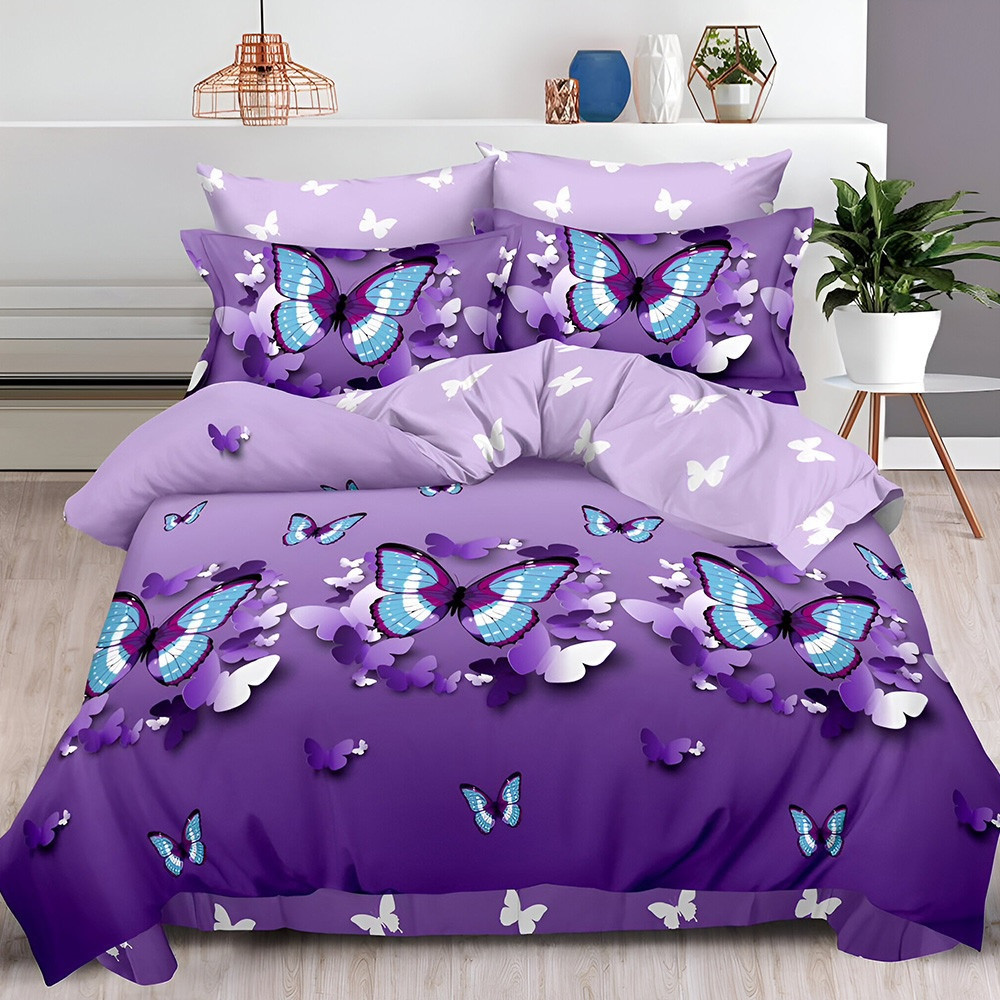 Двулицево спално бельо с ластик Пеперуди, 6 части, 18525. 200 x 230 см, Бяло/Лилав